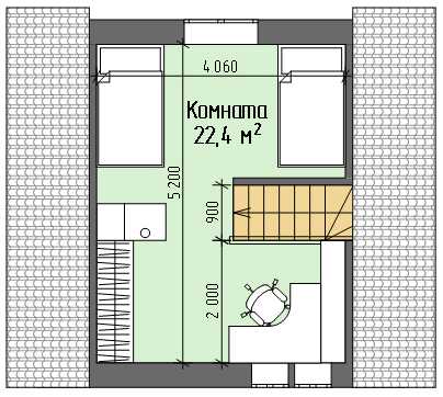 В таком небольшом доме важно максимально удобно и рационально разместить жилые и хозяйственные комнаты. Кухню и спальню обязательно разделить перегородкой с дверью. Количество зон в доме зависит от числа проживающих человек. Для двоих взрослых достаточно кухни и спальни. Можно сделать общую гостиную с диваном и телевизором, а супружескую кровать отделить ширмой. Площадь комнаты 16,5 кв. м, кухни – 10,5 кв. м и прихожей – 5,7 кв. м. Если их немного уменьшить, то вместится ванная комната 2х2 м. Если семья с детьми, то больше подойдет план дома 6 на 6 двухэтажный, здесь будет больше пространства для нормального отдыха всех членов семьи.