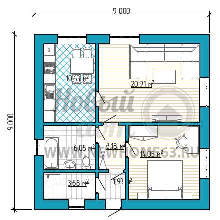 Планировка квадратного дома 9х9 м с отдельной кухней, просторной гостиной и одной спальной.