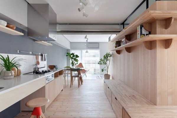 Совет. Кухню-столовую и гостиную зону делят с помощью мебели, отделки или освещения.