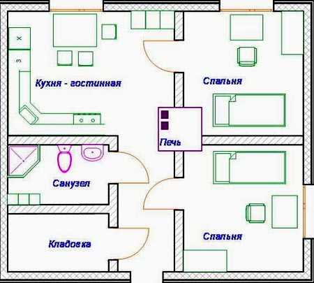 В основе самого простого варианта одноэтажного дома указанного размера лежит кухня-гостиная, которая занимает порядка 50% полезной площади. Она хорошо освещена 5-ю окнами. Кухонная часть (плита, разделочный стол, мойка, вытяжка и т.п.) удачно вписывается в нишу, которую образует выступ коридора-холла, и примыкает не к несущей внешней стене, а к внутренней стенке-перегородке. В оставшемся пространстве поместится круглая обеденная группа и зона отдыха с диваном и прочими атрибутами.