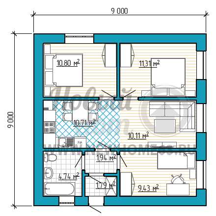 Планировочные решения одноэтажных квадратных домов 9 на 9