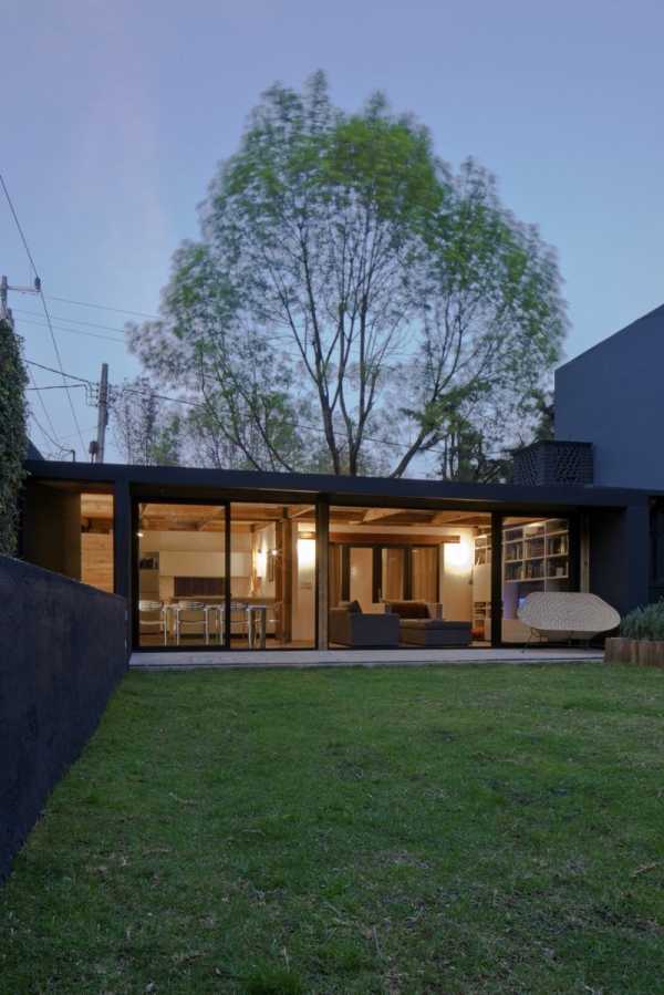 Одноэтажный дом в стиле хай-тек с общей жилой площадью в 120,5 м2 (при застройке в 149) и кубатурой 361,5 , рассчитанный на комфортное проживание большой семьи из 3-4 человек. Здание имеет отделку в сдержанных черно-белых тонах, эстетический эффект достигается за счет вытянутых вертикальных окон и локальной фасадной подсветки. Обширное остекление создает ощущения внутреннего простора, усиливаемого за счет соединения гостиной с уютной открытой террасой. Зона отдыха объединена столовой и вытянутой просторной кухней, вход в дом отделен тамбуром, выход в жилое крыло находится в углу. Камин расположен в центре гостиной и виден со всех сторон обзора, включая кухню.