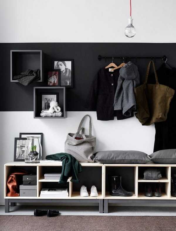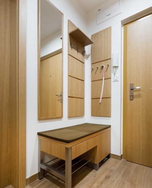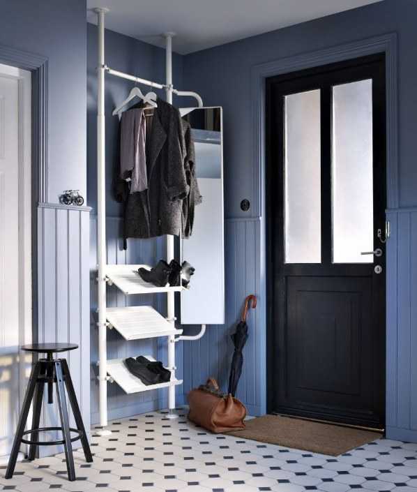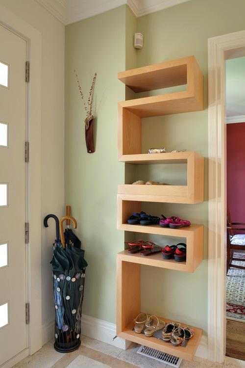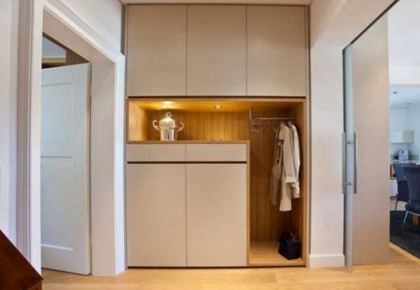 Рядом с входной дверью следует устроить полочки для мелочей или головных уборов. Нелишним будет разместить полку с крючками, на которые можно будет повесить сумку, зонт и т.д. Тут же следует установить и шкаф-купе, где будет размещаться верхняя одежда. Обязательно должна быть размещена обувница.