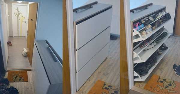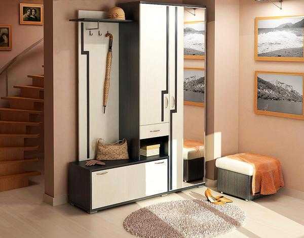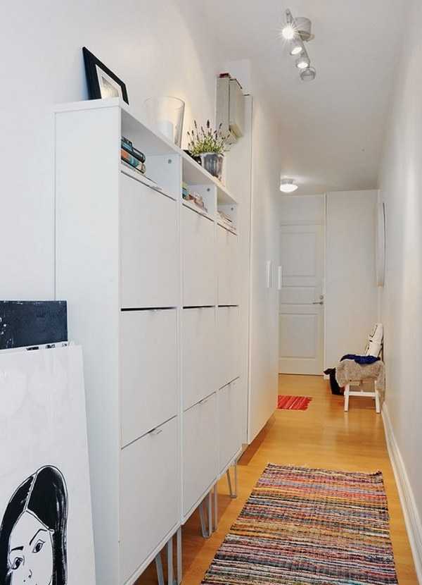 Самые маленькие коридоры — около 3 кв.м. Для большого шкафа нет места. Его можно заменить комодом с небольшой глубиной. Уместятся средства для ухода за обувью, аксессуары, шапки, шарфы, возможно, обувь.
