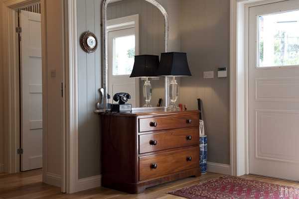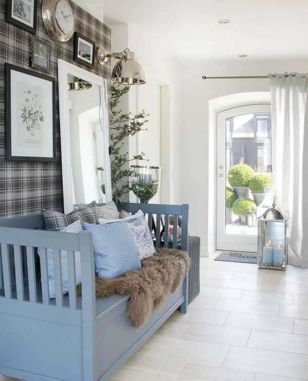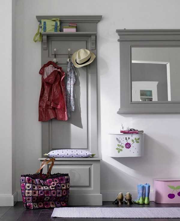 Над комодом располагают зеркало. Второе зеркало можно расположить на межкомнатной двери. Заботливый подбор декора, оттенка стен сделает даже такое пространство приятным, теплым. Напольная круговая вешалка станет местом для верхней одежды, сухих зонтов.