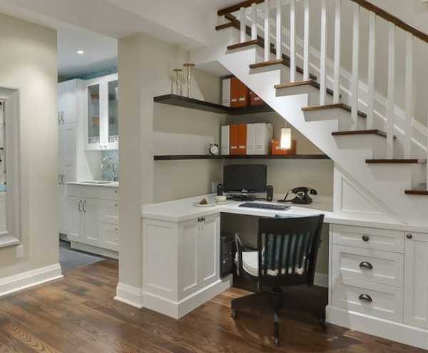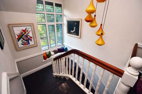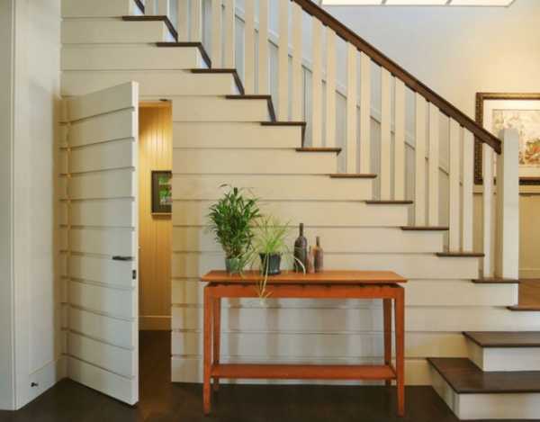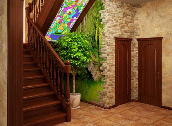 Если в коридоре есть лестница, простор для фантазии дизайнера увеличивается. Под лестницей может разместиться вместительная зона хранения. Для декора также открываются новые возможности. Если при входе напольное покрытие должно быть практичным, влагостойким, то лестницу можно украсить ковром. Или же выбрать напольное покрытие другого цвета. Оригинальное решение — устроить зоны хранения внутри ступеней.