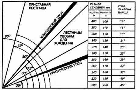 Угол наклона лестничного марша должен составлять не менее 20 градусов, ширина ступеней – не менее 100см, а глубина проступи – не менее 25см.