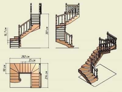 Чертёж деревянной винтовой лестницы на второй этажНапример, одномаршевая лестница требует, как минимум, один квадратный метр свободного пространства по полу и над собой – проём, который отчасти повторяет её прямоугольный вид, но при этом несколько уменьшен за счёт части, нависающей над первыми ступенями. Эти моменты следует предусмотреть ещё до начала проектирования конструкции.