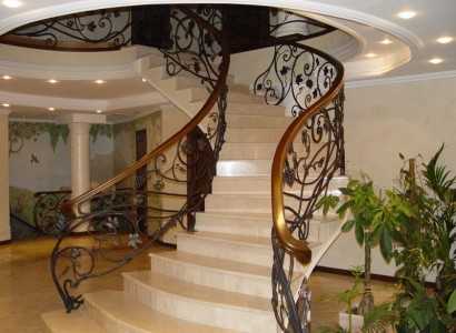 Комбинированная кованая фигурная лестницаВо втором варианте ступени выкладываются камнем. Необходимо отметить, что мраморные лестницы с коваными перилами можно по праву считать произведением строительного искусства.