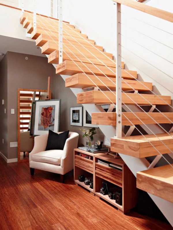 Рационально используют не только место под лестницей, но и между ступенями. Под ними создают специальные ящики для хранения вещей: обуви, журналов, газет. Слишком перегружать лестницы вещами не стоит, так как это может привести к разрушению конструкции.
