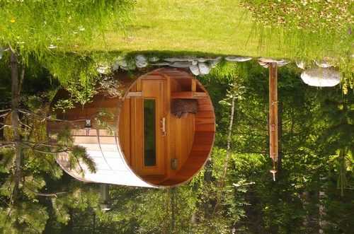 На фото — оригинальная конфигурация бани в виде бочки