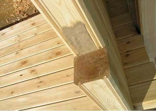 - Потолок делается подвесным из брусьев с обрешеткой и обивкой из деревянной вагонки. Стропильная система, в отличие от стен, изготавливается не из профилированного, а из обычного обрезного бруса.