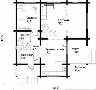 В доме, планировка которого изображена на следующем фото, будет комфортно проживать семье, состоящей не более чем из трех человек.