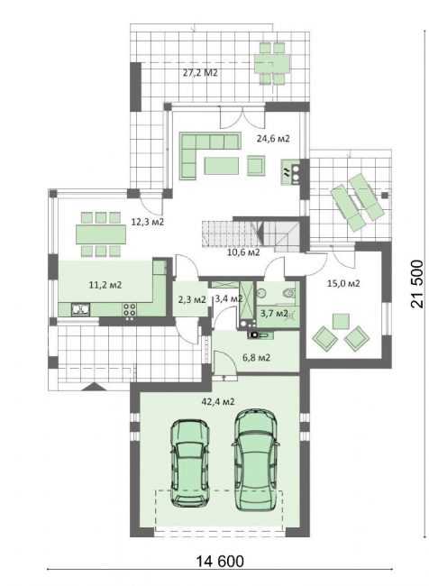 Дополнительным плюсом является пристроенный гараж на два автомобиля. Это очень удобно, когда в семье несколько человек имеют личную машину.
