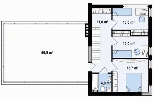 Планировка второго этажа может включать в себя как жилые, так и дополнительные помещения. Санузел также может быть оборудован на втором уровне. На плане отмечен и лестничный узел.