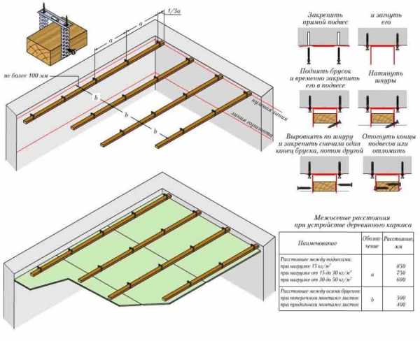Схема обустройства подвесного потолка с использованием металлических профилей, гипсокартона и утеплителя
