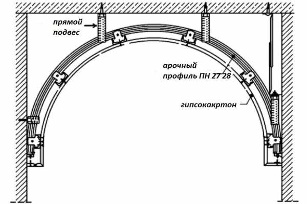 Позволяет сформировать конструкцию с радиальным изгибом. Изготавливается чаще всего из ПП 60/27. Стандартная длина профиля для гипсокартона 3 м. Минимальный радиус изгиба вогнутого элемента 500 мм.