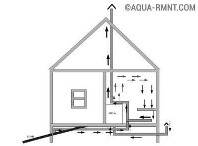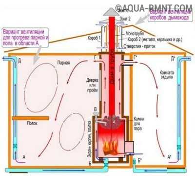 Прогрев и вентиляция бани. Обратите внимание, что вытяжное отверстие находится на небольшой высоте от пола — как правило, не выше 50 см. При данной схеме, в атмосферы выбрасывается отработанный пар. Более того, хорошо прогревается пол в парилке
