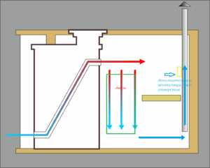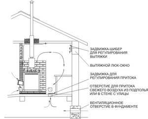 Чтобы печь работала как вытяжка, надо устанавливать ее так, чтобы поддувало было ниже половых досок. Следует учитывать, что вентилирование через печное поддувало идет только в период горения огня в печи. Если используются печи с кратковременной работой, без применения усовершенствованной системы вентиляции не обойтись.