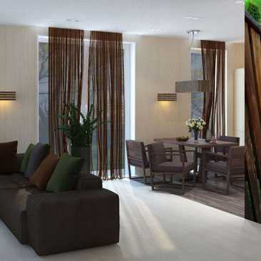Кухонный остров добавит дополнительную рабочую поверхность и послужит разграничительной линией между кухней и столовой. Переход от столовой к гостиной в помещении можно легко оформить, используя стеллаж или стильный диван. В стеллаже найдут место книги, журналы и газеты, а также мелкие атрибуты. А диван украсит зал-гостиную и станет любимым местом для времяпровождения в квартире.