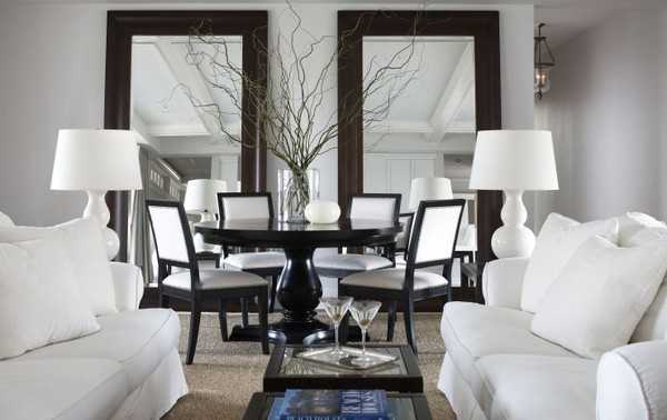 В принципе, цена обычных обоев или краски для внутренних работ позволяет назвать этот способ бюджетным. Если на полномасштабный ремонт денег нет, то на 5-6 рулонов или баночку краски средства обычно находятся. Останется лишь правильно подобрать оттенок, сочетающийся с цветовой гаммой уже имеющейся мебели, напольного покрытия и потолка. Нужно учесть и размеры помещения. Небольшие комнаты визуально увеличиваются, если выбрать отделочные материалы светлого пастельного оттенка. Доказательство – гостиная на фото ниже. Помещение такого размера обычно выглядит тесным, но тут спасают ситуацию большие окна, светлые стены и зеркальные поверхности. Последние не только отражают естественный свет, льющийся из дверных и оконных проемов, но и делают комнату больше. А вот темные цвета сделают комнату менее просторной. Даже при обилии естественного света и правильном размещении зеркал, комната с серо-синими стенами кажется маленькой.