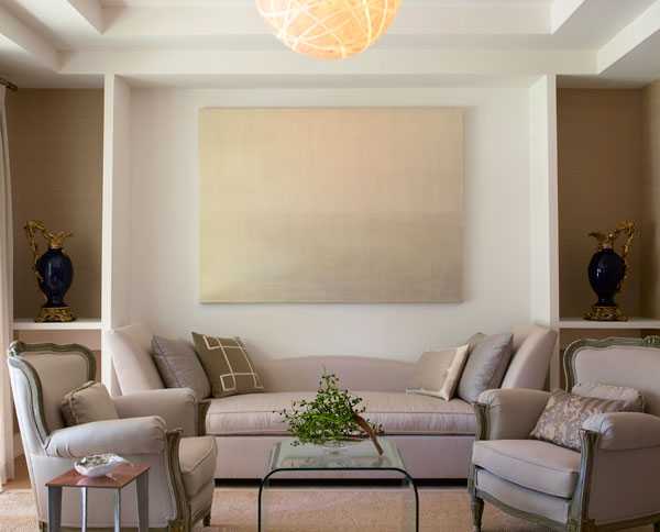 Потолок и стены лучше оформить в светлой палитре: светло-серый цвет стен или светло-бежевый и белый потолок. А можно сделать навесные конструкции, где уровень будет на тон светлее стен, добавить точечное освещение. Таким способом можно просто и со вкусом оформить интерьер гостиной и превратить ее в спокойную лаунж-зону. Лишние предметы не нужны. Одного элемента будет достаточно, можно выбрать арт-объект или картину.