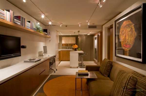 Ещё дизайнеры советуют не украшать полы. Или украсить небольшим по размеру паласом, ковром. Потолок заметно «вырастет», если его окрасить на один или два тона светлее стен. Расположение точечного освещения будет ещё одним плюсом. В процессе проектирования маленькой квартиры лучше отказаться от габаритной мебели. Уместно использовать стильные модели средних размеров, которые сохраняют «живое» пространство. Ключевая идея – в домах и квартирах всего должно быть в меру. Фото интерьера представлены ниже.