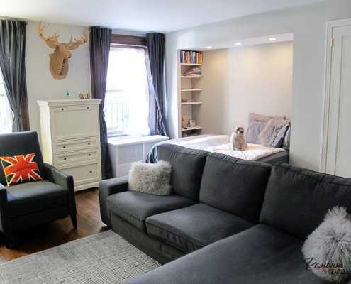 Квартиры с очень высокими потолками (до 4 м), следует попытаться реорганизовать так, чтобы максимально использовать потенциал высокого помещения. К примеру, можно возвести конструкцию антресольного этажа, и разместить на нем спальную зону. Как следствие, вы получите свободную основную площадь, на которой установите другие, не менее важные предметы мебели.