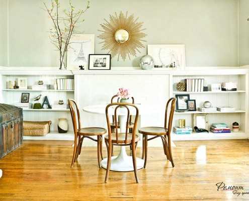 Для собственной кухни в небольшой квартире-студио вы можете использовать венские стулья — они отлично впишутся даже в самый минималистский и технологичный интерьер. В гостиной повесьте на стену старинное зеркало с пятнами патины на амальгаме, повесьте люстру с деревянным основанием, и разместите в углу вместительный комод с антикварными ручками.