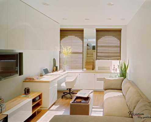 Не стоит обставлять помещение большой и громоздкой мебелью, следует заменить ее, на шкафы купе и модульную мебель. Шкаф купе значительно увеличит пространство в небольшом помещении и кроме того может разделить его на две половины. Без текстиля естественно в помещении никак не обойтись.