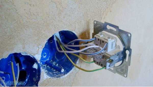 Для этого коричневый проводок от коробки мы должны подсоединить с управляющим контактом, а синий и желто-зеленый – с исполнительными и вставляем переключатель в подрозетник.