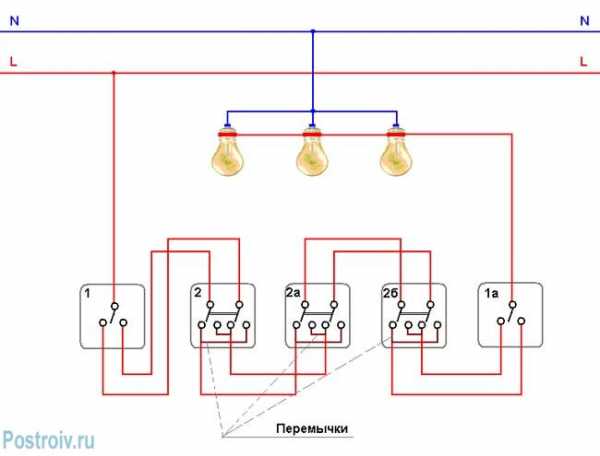 Такая схема подключения включает в себя два проходных переключателя, а оставшиеся в цепи будут перекидными, по сути являющимися доработанными двухклавишными.