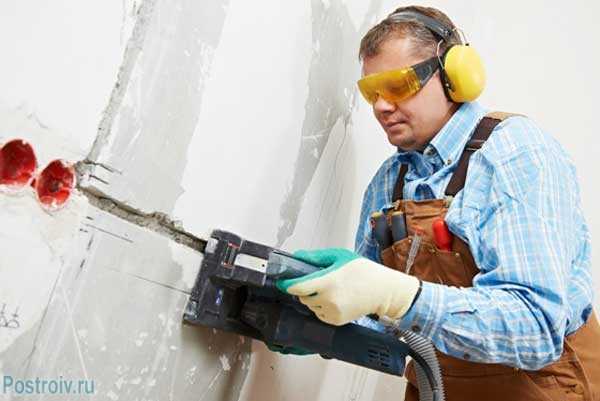 - Перфоратором высверливаем гнезда для выключателей и пробиваем штробы для укладки проводов.