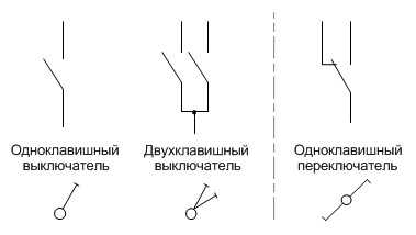 Внешне этот элемент электрической цепи похож на выключатель – тот же корпус, одна или несколько клавиш, фиксирующихся в двух положениях. Однако его физическая сущность совершенно иная. Если выключатель разрывает цепь, то проходной переключатель производит коммутацию линий. Кинематическая схема выключателей и переключателей представлена ниже.