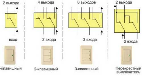 Промышленностью выпускается четыре типа проходных переключателей. Три из них различаются количеством клавиш, которых может быть одна, две или три. Так реализуется возможность управлять несколькими потребителями электрической энергии. Четырехклавишные модели не выпускаются. Просто потому, что каждому трехполюсному контакту нужно две выходные линии. Прокладывать больше шести токоведущих жил технически сложно из-за увеличения размера канала для их размещения и чрезвычайной запутанности схемы.