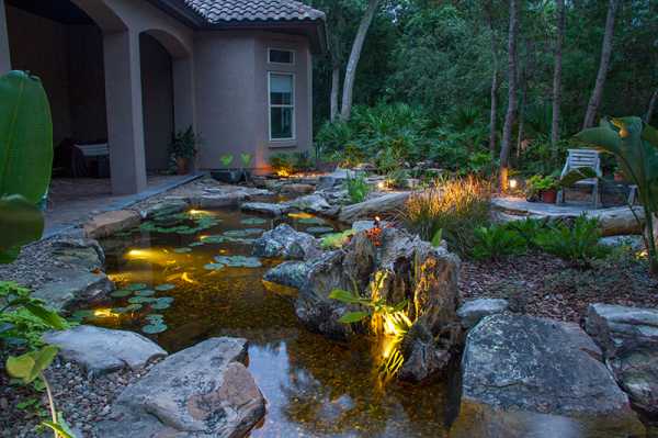 Большинство ландшафтных дизайнеров рекомендуют располагать пруд возле дома. Это упростит вам его освещение, не требуя для себя отдельных фонарей и ламп. К тому же возле дома всегда достаточно свободного пространства с естественным освещением, т.к. рядом нет высоких деревьев и густой растительности, забивающей свет.