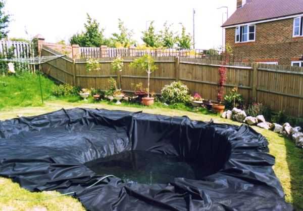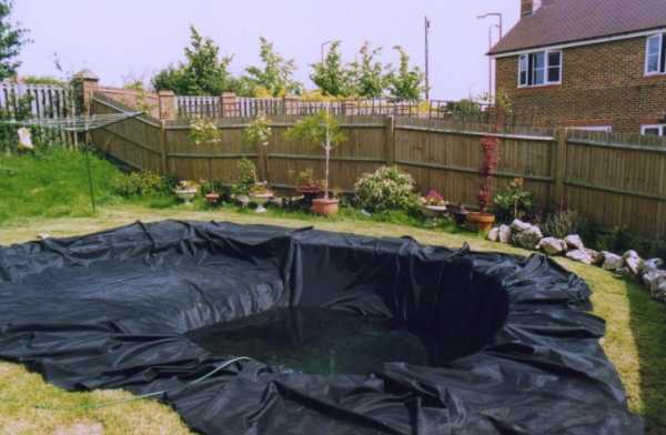 Пленка должна быть очень прочной и плотной, чтобы выдержать тяжесть воды, которую мы по итогу вольем в пруд. Потому не экономьте на этом первостепенном материале и выбирайте его с умом – толщина пленки должна быть не менее 300 микрон, чтобы не порваться под постоянным давлением.