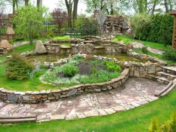 Следующая подходящая декорация пруда на даче делается из камней. Это могут быть небольшие ступеньки, подчеркивающие неровный рельеф, ограждения на каменной основе или статуи, которые пишутся в природный ландшафт. Пруд из камней на даче своими руками можно выполнить в разной цветовой гамме.
