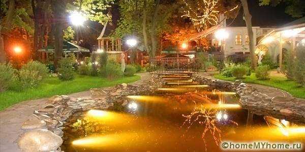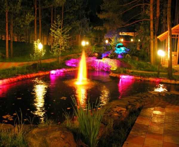Дизайн пруда на даче своими руками, фотоРаспространенная идея, как облагородить пруд на даче своими руками – использование цветной подсветки прямо в воде или по периметру. В вечернее и ночное время она будет привлекать внимание к этом объекту и создаст комфортные условия для спокойного отдыха, настраивая на размышления и подчеркивая естественную красоту.