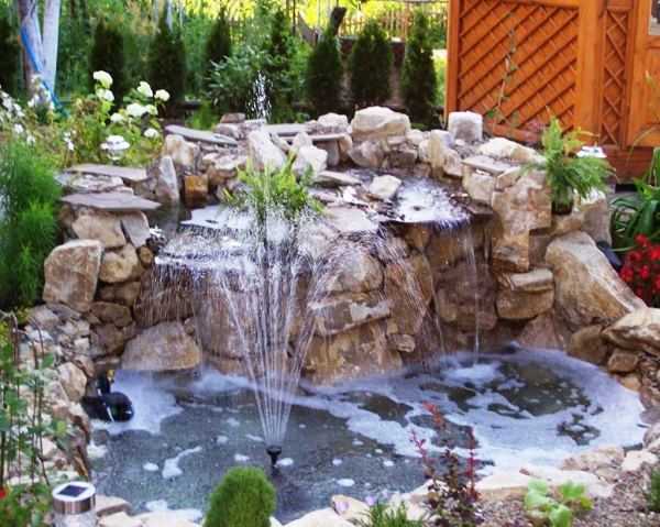 Один из вариантов, как украсить пруд на даче своими руками, предполагает обустройство фонтана. Это может быть как крупный фонтан для пруда, размещаемый в центре, так и множество небольших фонтанчиков на даче, которые подчеркнут красоту водного объекта.