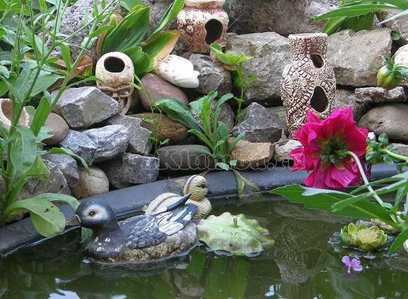 Помимо камня, который несет важную функцию и держит пленку на берегу, вы можете поставить декоративные фигурки, горшки с цветами и поделки, сделанные вами для дачи своими руками. Оформите пруд так, чтобы он отражал вашу творческую натуру и радовал глаз.