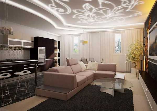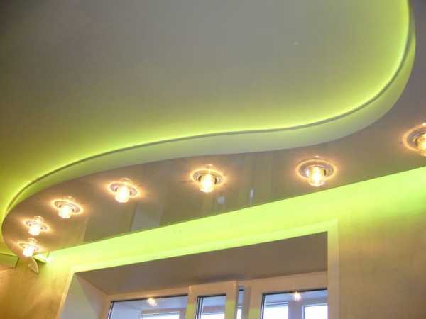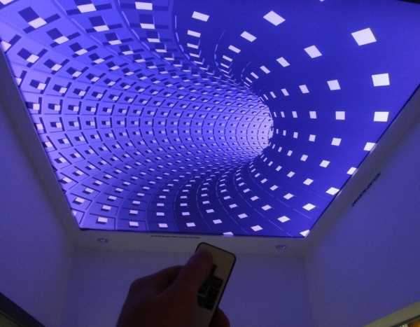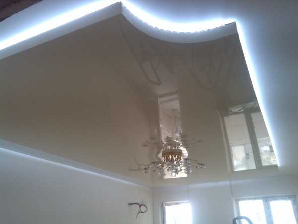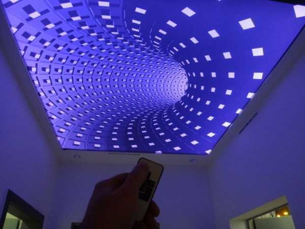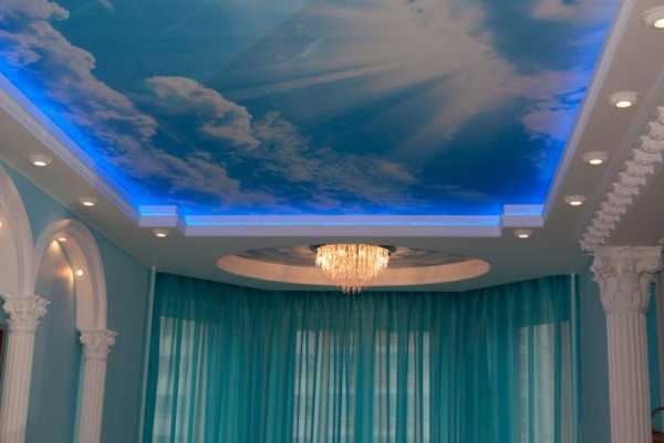 Очень красиво на натяжных потолках выглядят материалы, пропускающие свет. Очень популярна установка цветного регулируемого освещения ленточного LED-типа под потолком.