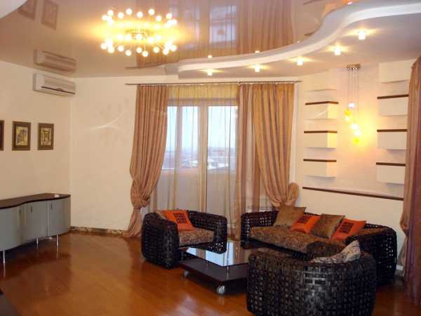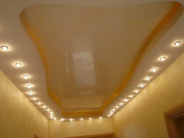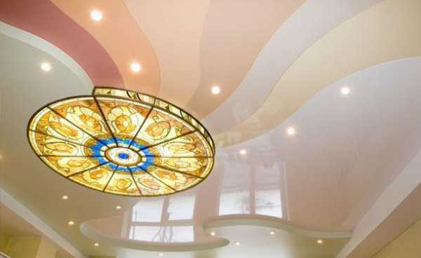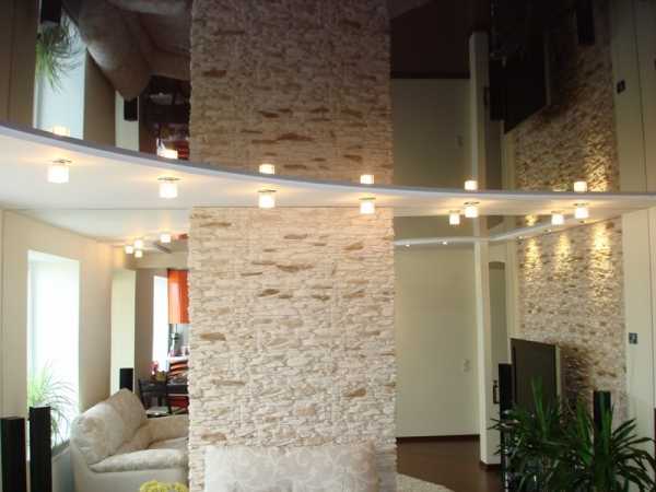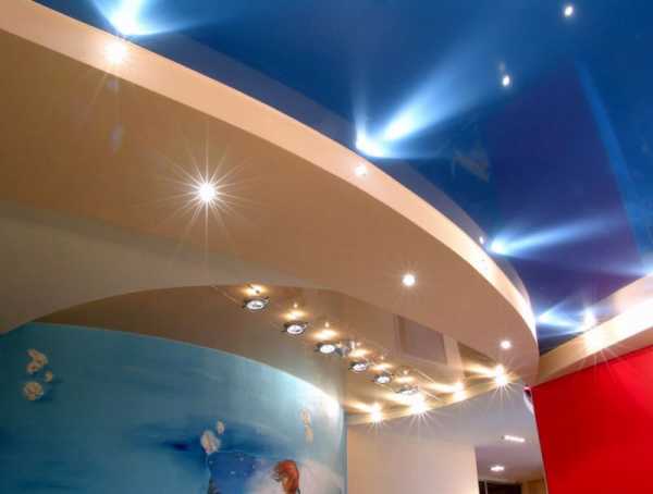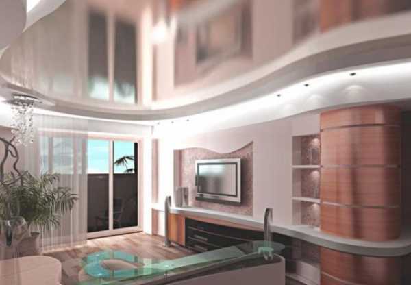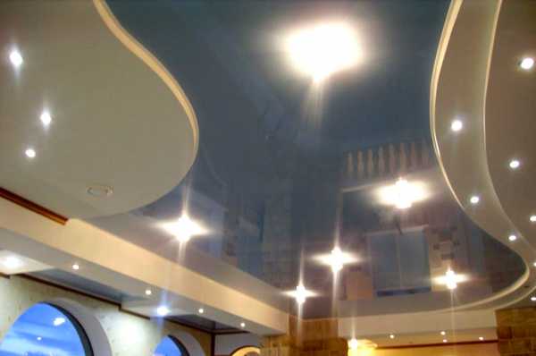 6. Многоуровневые натяжные потолки – в виде ступенчатых конструкций, криволинейных поверхностей, под разными углами наклона, уровнями с гладкими и волнистыми поверхностями в сочетании со встроенным освещением, поражают своей красотой.