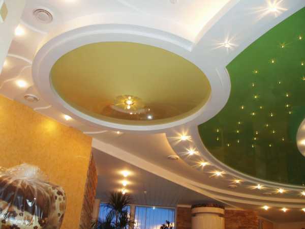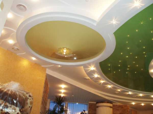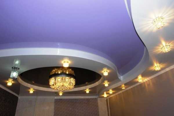 Особенно эффектны многоуровневые потолки с фигурными элементами. Принимая во внимание интерьерный стиль помещения, для таких потолков используют и пленочные и тканевые полотна. Встроенные светильники умножают красоту и великолепие потолочной конструкции с натяжными полотнами.