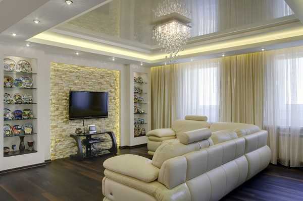 Гостиная комната – центральная, для нее подойдет тканевая модель, возможно использование пленочного варианта.