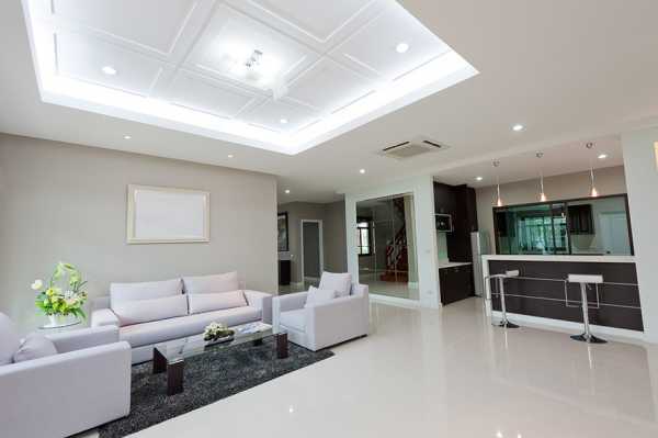 Надо учесть что натяжные «мраморные» потолки зрительно уменьшают пространство, за исключением светло-серых и молочно-белых оттенков, которые в меньшей мере способствуют этому эффекту. Исправить этот недостаток можно при помощи подсветки.