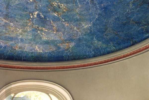 Пленки «под мрамор» настолько точно имитируют этот натуральный камень, что несведущему человеку сложно отличить одно от другого. Такие потолки часто используют при оформлении галерей, залов для торжеств и официальных приемов.