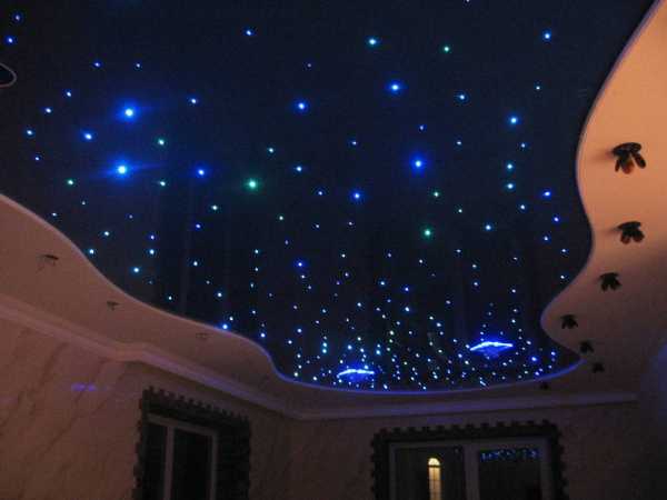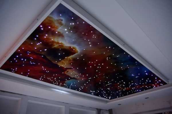 Особенно эффектно натяжное полотно с оптическими волокнами. Оптическое волокно выступает основным элементом «звездного неба». Нити волокна выполняют функцию передачи светового потока. Подсвечивание окончаний этих волокон с эффектом мерцания создает вид ночного неба невообразимой красоты.