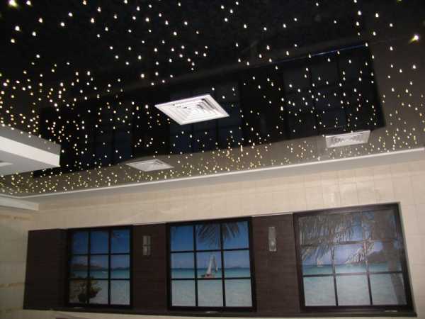 Наиболее эффектны натяжные потолки с оптическими волокнами. Кончики этих нитей подсвечиваются, что создает эффект ночного звездного неба. Применение специальной техники обеспечивает мерцание с заданной периодичностью.