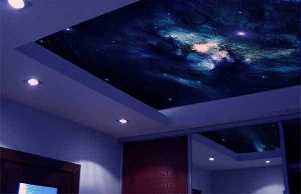 Красивый натяжной потолок, оформленный в виде звездного неба, обладает располагающей к общению атмосферой. Имитация звездного неба актуальна не только в жилых комнатах, но и с успехом используется в помещениях, предназначенных для отдыха и развлечений. С помощью современной светотехники можно воплотить разные сценарии ночного неба: мерцание звезд, падение комет. Для воспроизведения звездных шедевров используются светодиоды, галогеновые и люминесцентные лампы.